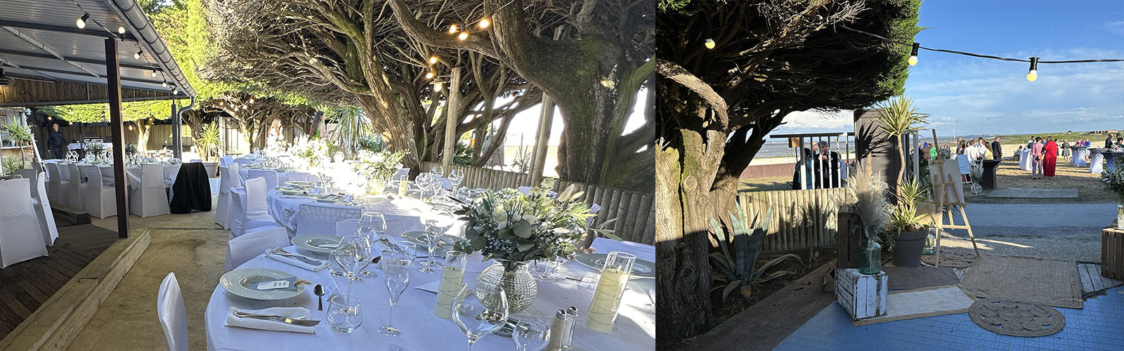 La beauté du lieu sublimait ce moment. Le restaurant en extérieur, niché dans ce décor naturel unique, était entouré de verdure et offrait une vue imprenable sur les paysages marins de l’Île d’Aix. Le préau en bois, décoré avec des touches délicates de fleurs et de guirlandes, ajoutait une note rustique et élégante. Au fur et à mesure que la lumière du jour diminuait, les guirlandes guinguette prenaient toute leur importance, enveloppant l’espace d’une lumière douce et apaisante.