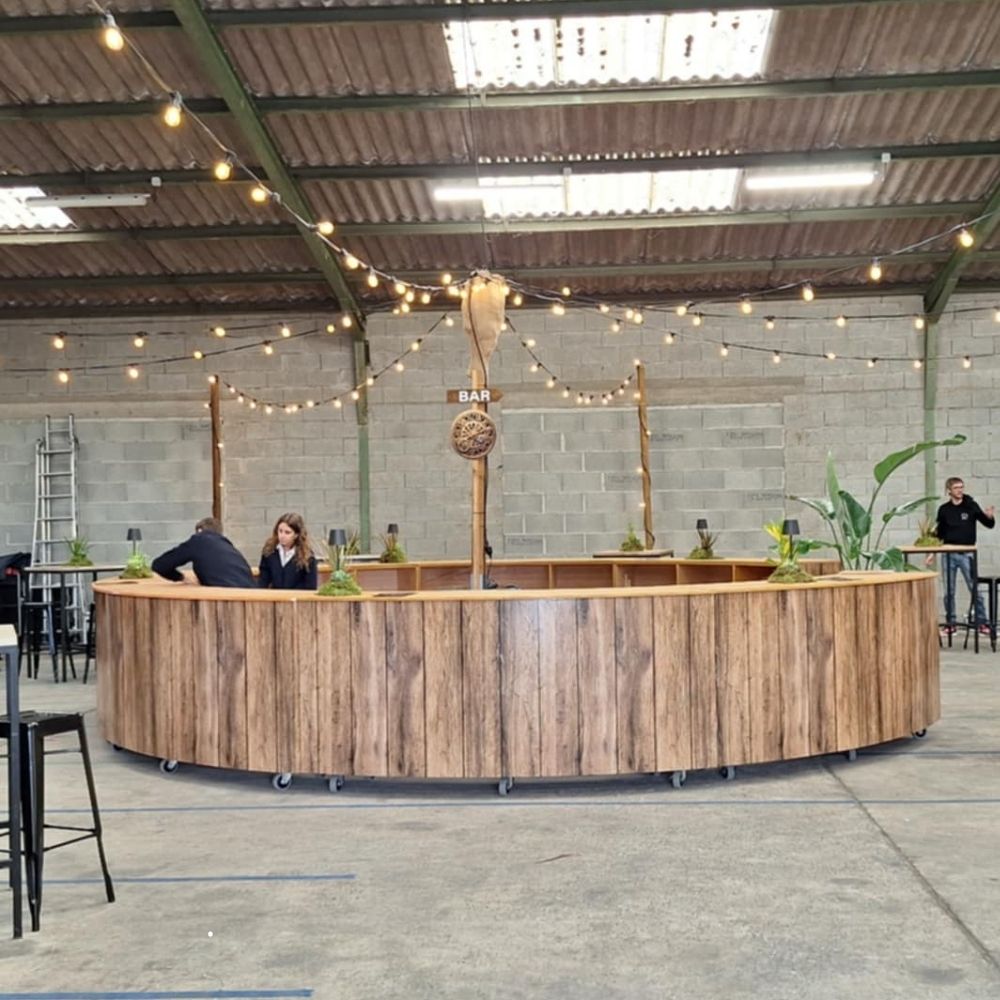 Ce bar est composé de 7 modules assemblés, chacun mesurant 250 cm de longueur x 110 cm de hauteur x 70 cm de profondeur. L’ensemble forme un cercle élégant et fonctionnel, parfaitement adapté pour accueillir entre 100 et 200 personnes.