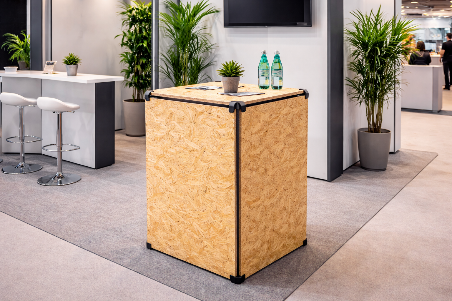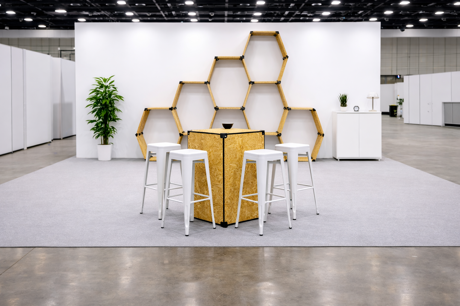 Dans un salon dédié au vin, aux produits régionaux ou à l’artisanat, le mange debout en OSB renforce l’identité visuelle de votre stand. Il met en valeur vos produits sans les éclipser, tout en créant une atmosphère conviviale et professionnelle. Associé à des tonneaux, des caisses en bois, des tabourets hauts ou une signalétique soignée, il devient un véritable élément scénographique.