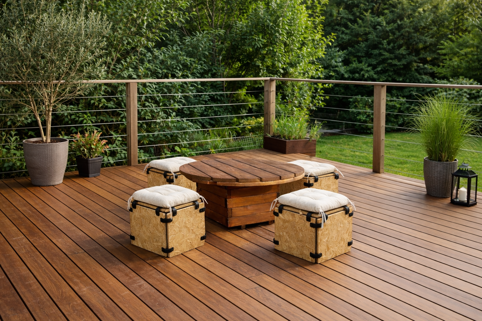 Le coussin, parfaitement ajusté aux dimensions 40 x 40 cm, apporte un confort supplémentaire tout en conservant l’esprit brut et authentique du bois. L’alliance entre la texture naturelle de l’OSB et le textile du coussin crée un contraste chaleureux, idéal pour sublimer vos événements.