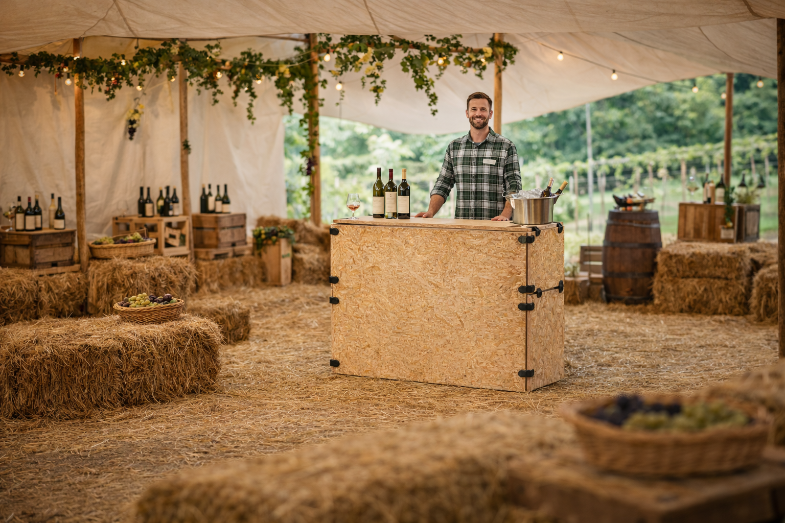 Vous recherchez un comptoir original, robuste et parfaitement adapté à vos événements ? Découvrez notre comptoir en OSB monté avec connecteurs, une solution idéale pour habiller un stand, aménager un espace bar ou structurer un coin accueil avec style.