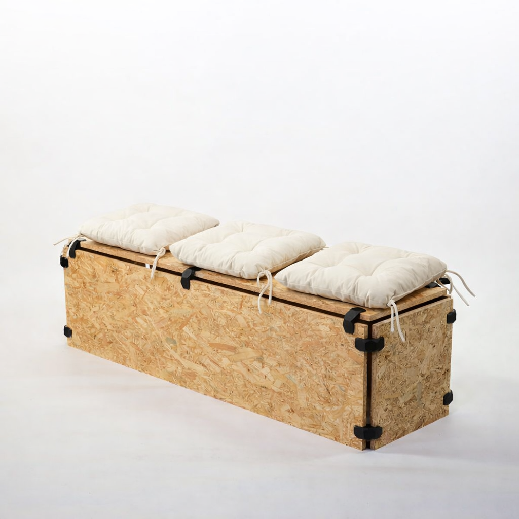 Fabriqué en OSB 18 mm, ce banc est pensé pour supporter un usage événementiel intensif. Sa structure épaisse garantit une grande résistance tout en conservant un design minimaliste et moderne. Le coussin apporte un confort supplémentaire, idéal pour les repas, cérémonies ou espaces détente.
