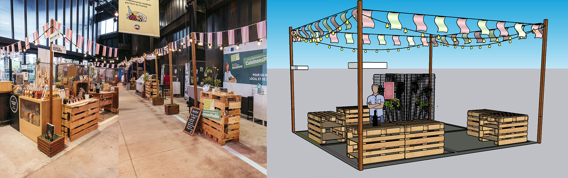 Grâce à une conception soignée et à une mise en place rigoureuse, nous avons pu répondre aux attentes du client tout en respectant l’esprit du festival. Vous trouverez sur cette photo la modélisation 3D correspondant à la demande initiale, et juste au-dessus, le résultat final tel qu’il a été installé sur le salon. Une belle réalisation qui illustre notre savoir-faire en scénographie événementielle !