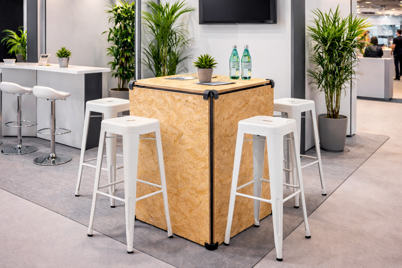 Dans un salon dédié au vin, aux produits régionaux ou à l’artisanat, le mange debout en OSB renforce l’identité visuelle de votre stand. Il met en valeur vos produits sans les éclipser, tout en créant une atmosphère conviviale et professionnelle. Associé à des tonneaux, des caisses en bois, des tabourets hauts ou une signalétique soignée, il devient un véritable élément scénographique.