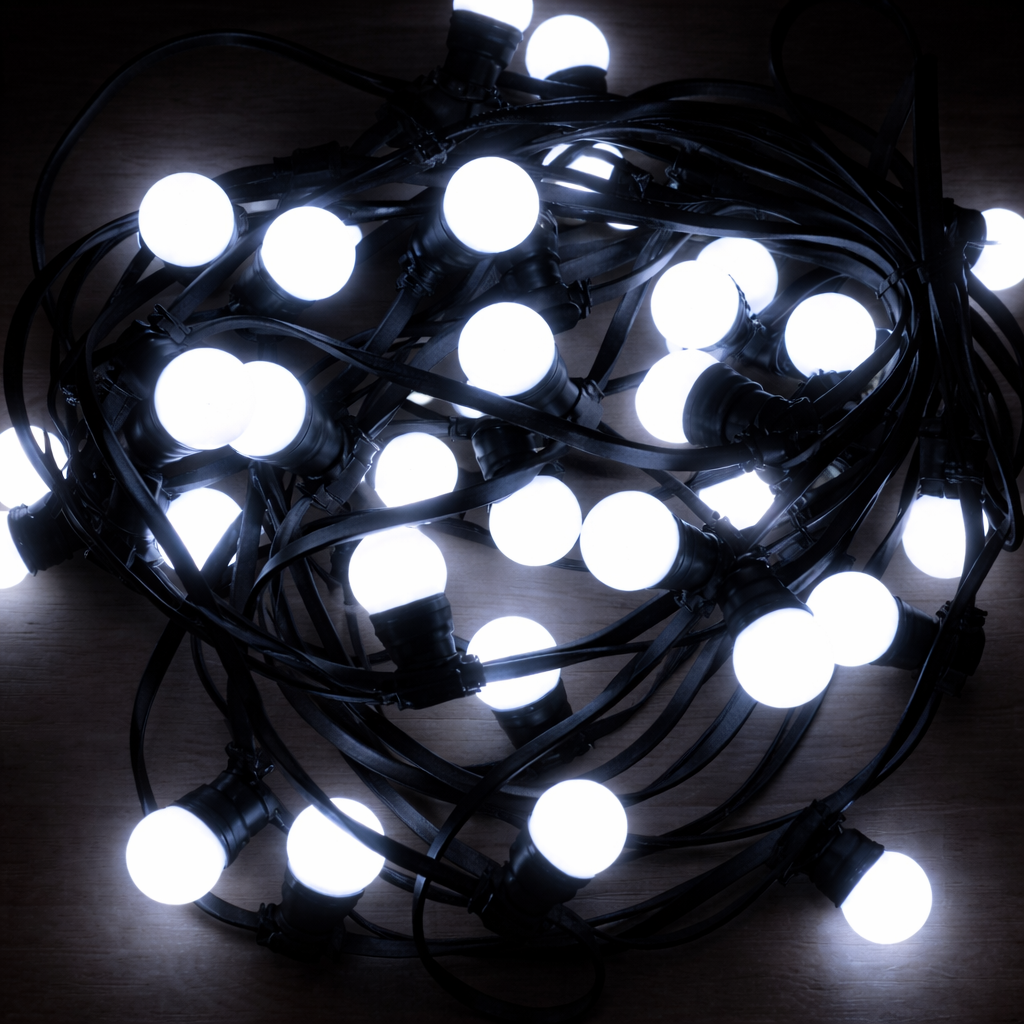 • Cette guirlande festive est livrée avec 20 ampoules Blanc Froid led de 1W de type G45