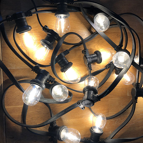 Les guirlandes Ma Guinguette proposées en location sont d'une longueur de 10 mètres pour 20 globes ampoules E27. Connectables entre-elles sur plusieurs centaines de mètres permettant de réaliser l'éclairage complet d'un événement sur une simple prise 16A. Le câble supporte une puissance de 2200w. L'espacement entre les ampoules est de 50 cm afin de conserver une mise en lumière homogène. La guirlande est composée d'ampoules leds à globe leds pour une faible consommation. Ces guirlandes répondent à la norme IP44, vous donnant la possibilité de faire des mises en éclairage en extérieur comme en intérieur. Idéal pour un diner dehors en plein été avec l'ensemble de vos convives.