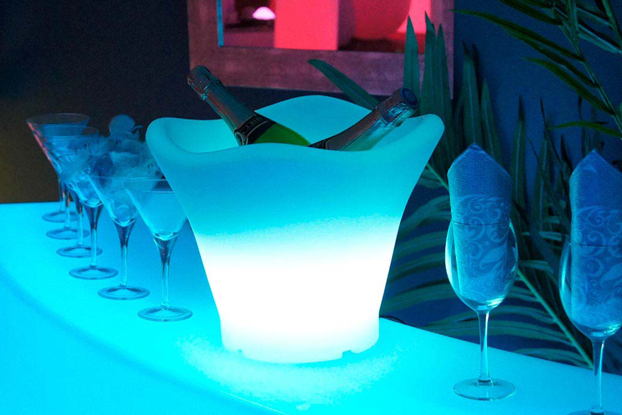 Le Seau à Champagne Lumineux à LEDs en location peut être utilisé en intérieur ou en extérieur car il est étanche.