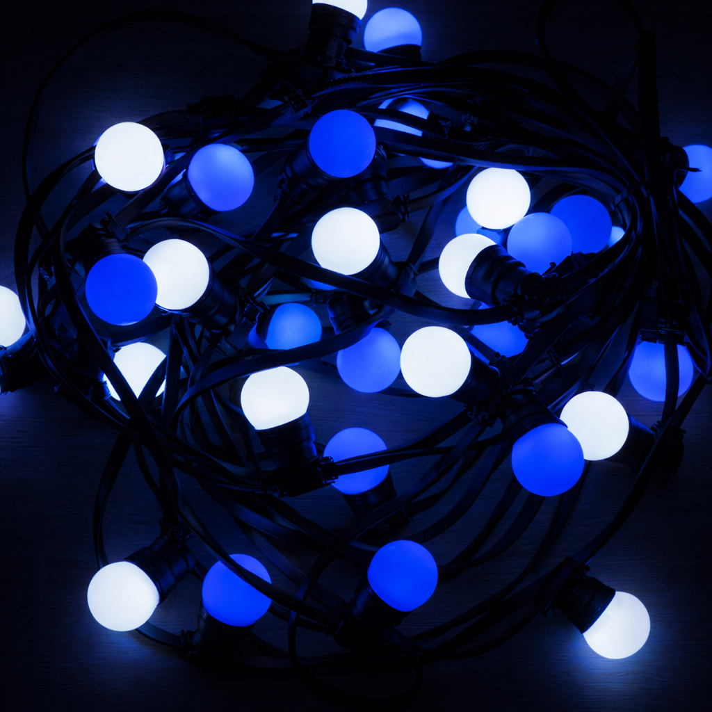 Nos guirlandes guinguette associent des ampoules bleu intense et blanc froid, alternées avec élégance pour refléter parfaitement l’esprit des Fêtes de Mont-de-Marsan. Le blanc froid apporte une luminosité vive et moderne, tandis que le bleu installe une ambiance festive, fraîche et immersive. Ensemble, ils créent un éclairage dynamique qui attire le regard et valorise instantanément les lieux.