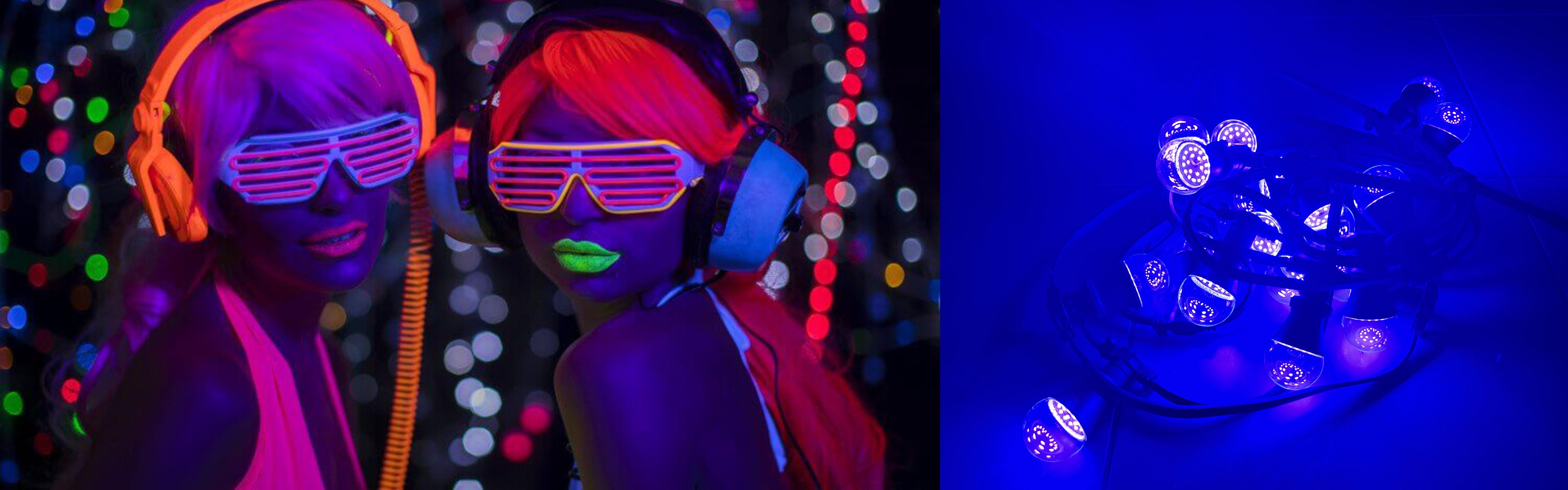 Éclairage : Assurez-vous d'avoir installé dans la salle une quantité suffisante de guirlande néon ultraviolette pour créer l'effet lumineux recherché. Vous pouvez également expérimenter avec des lumières stroboscopiques et des lumières LED colorées pour accentuer l'ambiance.