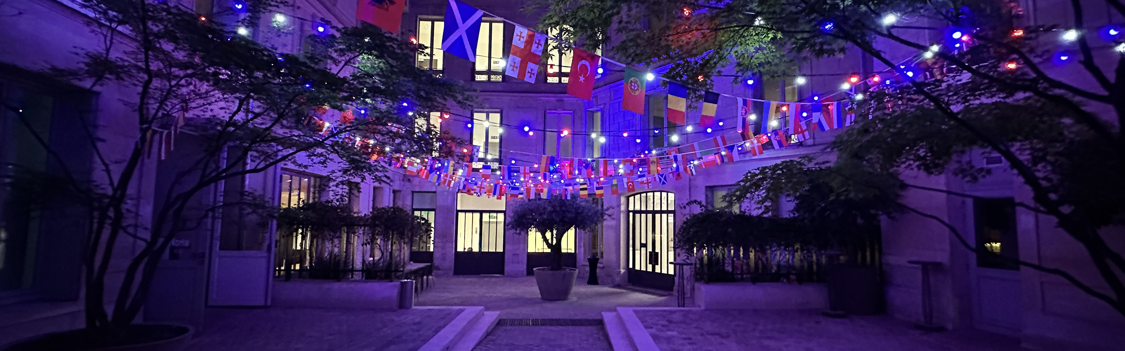 Quelques dizaines de mètres de guirlandes guinguettes "bleu blanc rouge" dans une cours Parisienne accompagnées de Spots leds pour toute la durée de l'événement.